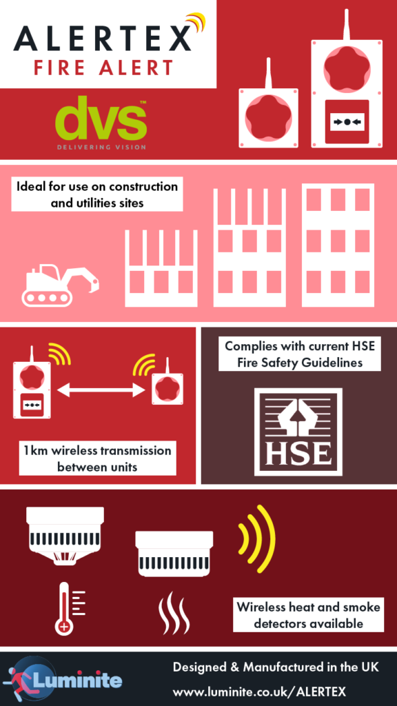 ALERTEX Fire Alert units comply with current HSE Fire Safety Guidelines (HSG168) regarding audible and visual alerts to fire on construction sites. There are 32 different alert sounds to choose from that are accompanied by a visual flashing beacon light.